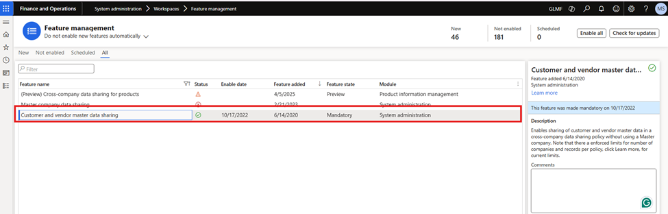 Enable the Feature: The “Customer and Vendor Master Data Sharing” feature must be enabled in the Feature Management workspace.