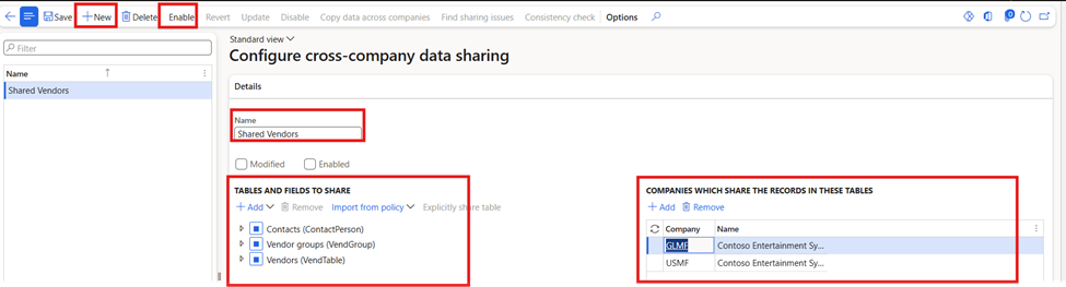 For example, when sharing vendor data, you’ll need to choose the VendTable, Vendgroup and its related tables such as VendBankAccount and ContactPerson.