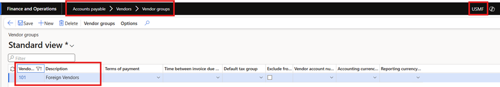 In the USMF legal entity, create a new vendor group, for example,101 Foreign Vendors