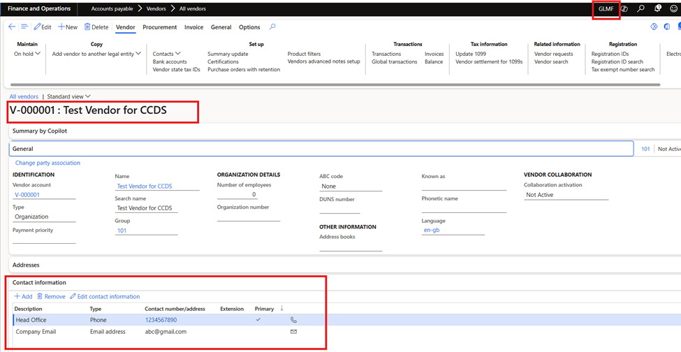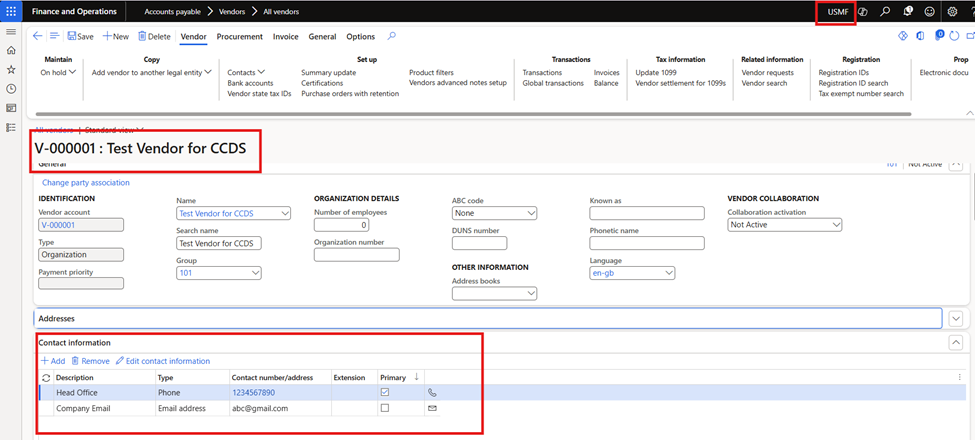 The vendor is created, and you can view the vendor details and Contact details in the USMF legal entity.